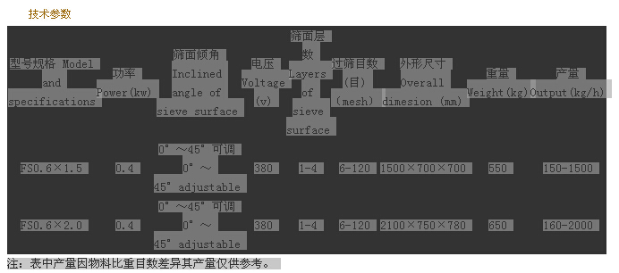 产品概述 FS系列方形筛,是我厂九九年自行开发研制的新一代筛粉设备,该机以它独有的高效、节能、低口音等特性深受广大用户的欢迎,广泛适用于医药、化工、食品等行业的各种物料连续过筛,根据用户需要可制做成1-4层筛面。 设备特点 &n…