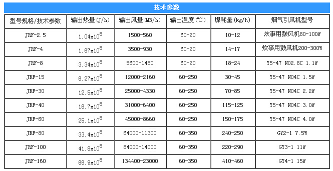 注意 环境基准温度标准按18℃土2℃,煤的热值以5500kca/kg计算。 表中热风温度是按输出风量确定的。热风炉JRF4型的热风温度高可达200℃以上,JRF5、 JRF6热风温度高可达300℃以上(特殊制造可达500℃以上),用户根据需要进行调整。 热风炉烟窗配置高度:JRF4型3-5米。JRF5、JRF6型为5-8米。 表中外形尺寸大意应位置见热风炉安装示意图。 炉膛下部内侧壁上的耐火层以炉蓖处为起点,其高度:JRF4-4型为0.5米,可现场安装。 JRF6型为链条炉排式燃烧装置。 |